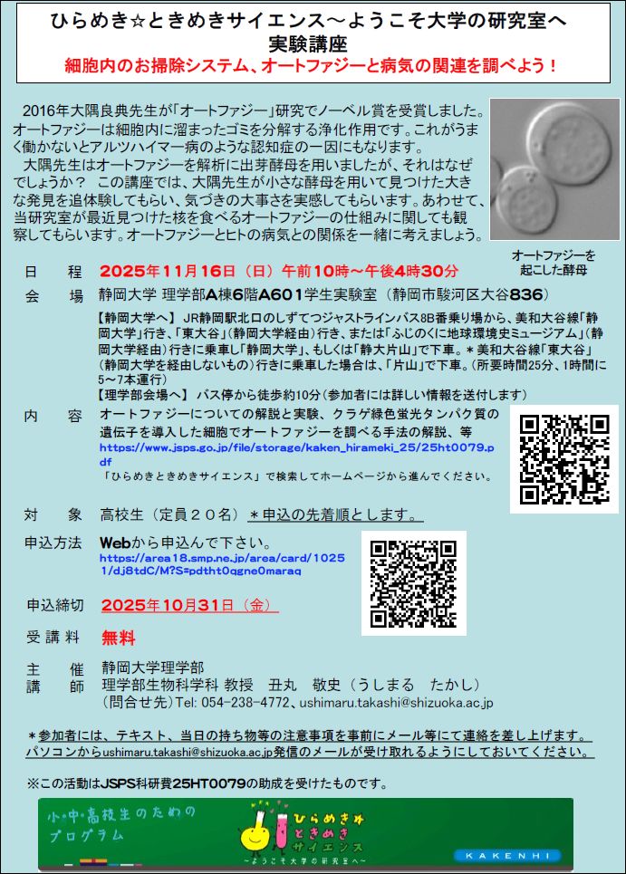 高校生を対象にした公開実験講座 ひらめき☆ときめきサイエンス「細胞内のお掃除システム、オートファジーと病気の関連を調べよう!」(理学部生物科学科 丑丸敬史教授)が、2025年11月16日(日)に開催されます。